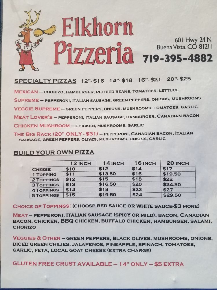 Elkhorn Pizzeria in Buena Vista, Colorado, offers a delightful selection of pizzas and pho, surprising customers with their diverse menu. With many vegetarian options and a cozy mountain atmosphere, this casual spot provides a comfortable dining experience. Customers rave about the phenomenal pizzas, flavorful pho, and friendly service. Whether you're looking for a comforting slice of pizza after a day outdoors or craving a satisfying bowl of pho, Elkhorn Pizzeria delivers on both taste and value. The private lot parking, outdoor seating, and TV make it a great spot for a laid-back meal with friends and family. Don't miss out on the BBQ wings and the rare steak pho – they're absolute crowd-pleasers at Elkhorn Pizzeria.